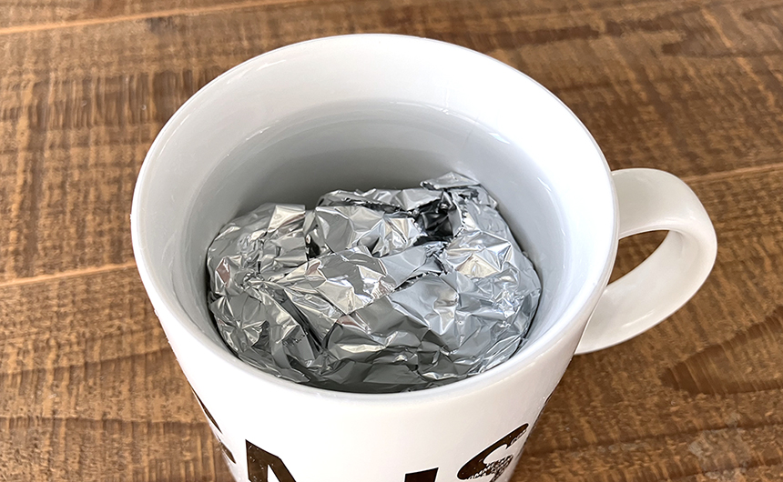 ポイントは、アルミホイルが必ず水面下にくるようにすることです。これにより、アルミホイルがマイクロ波を反射してバチッと火花を飛ばす危険を回避することができます。また、電子レンジ加熱すると水が蒸発してアルミホイルが水面に出てしまうおそれがあるので、水は多めに入れておきます。