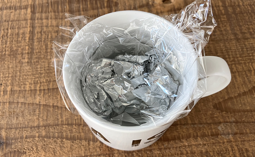 すきまが多少あっても問題はありません。ラップでアルミホイルが水面に出ないようにします。ラップはマグカップに合わせて切ったり大きいものを折りたたんだりして使います。