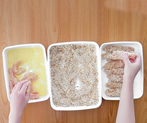 2鶏肉に、バッター液、パン粉の順に衣付けをする。