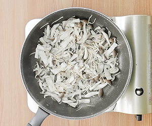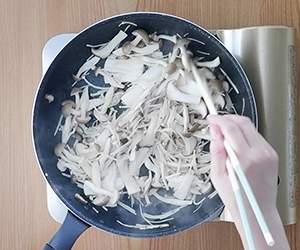 3きのこがしんなりしたらAを加え、汁けがなくなるまで炒め合わせる。
