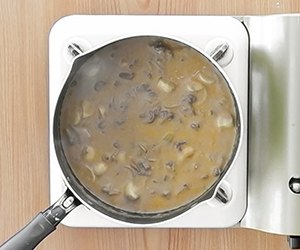 2鍋にバターを入れて火にかけ、牛肉を加えて炒める。火が通ったら、玉ねぎとマッシュルームを加えて、玉ねぎが透明になるまでさらに炒める。
