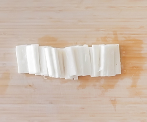 1長芋は皮をむき、長さ4cm、幅7㎜、厚さ5㎜ほどの大きさに切る。赤とうがらしは半分にちぎり、タネをとり除く。