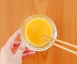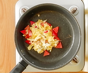 3小さなフライパンにサラダ油をしき、中火で熱したらパプリカとしらすを炒める。しんなりしたら2を加えて炒め合わせ、全体が固まるように焼く。