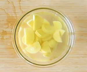 2じゃがいもは半分に切り、さらに1cm幅に切る。水にさらしてからザルにあげて水けをふく。