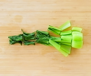 2厚揚げは熱湯をかけてザルにあげ、2cm大に角切りにする。チンゲン菜は塩の入った熱湯で(分量外)1分ほどゆで、一口大に切る。
