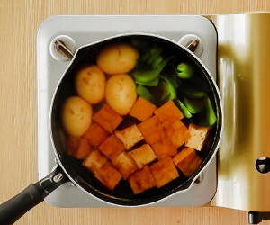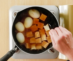 3鍋に、ゆで卵と厚揚げと、Aを全て加え、落としぶたをし、10分ほど煮て火を止める。