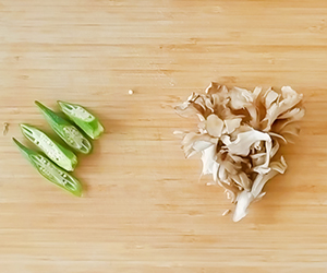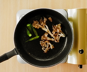 2フライパンに米油を引き、まいたけとオクラを弱火でじっくり両面に焼き色がつくように焼く。