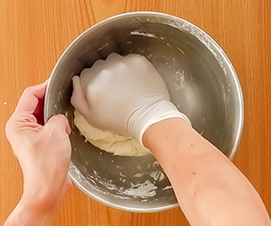 1Aをザルに入れ、ボウルにふるい入れる。菜箸などでよく混ぜる。ここに水を70mL加え、手でなめらかになるまでこねる。残りの10mLは耳たぶくらいの柔らかさを目指して調整する。丸くまとめてラップに包み、冷蔵庫で30分置く。(一晩置いてもよい)
