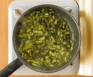 4フライパンにサラダ油を薄く塗り、包み終わりを下にして両面を焼き付ける。再度包み終わりを下にし、水を入れて蓋をして、弱火で水分が無くなるまで蒸し焼きにする。