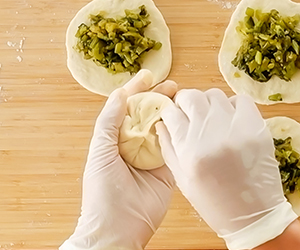 3まな板の上に打ち粉をふる。2を4等分にして丸め、まな板の上に置き、手のひらかめん棒で円形に伸ばす(直径10〜12cm)。野沢菜を4つに分け、生地の真ん中に入れて、包む。
