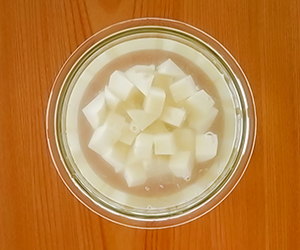 2じゃがいもは耐熱容器に入れ、ひとつまみの塩をまぶす。ふんわりとラップをかけ、電子レンジ600Wで3分蒸す。