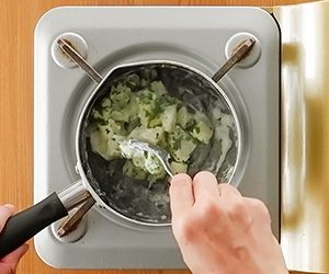 3小鍋にじゃがいもを入れ、牛乳と粉チーズを加えて水けがなくなるまで煮る。最後にパセりを混ぜ合わせ、こしょうをふる。