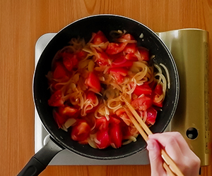 3同じフライパンに、玉ねぎとにんにくを加え、しんなりするまで炒める。トマトを加え、さらに炒める。