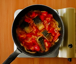 4Aを加え、ひと煮立ちしたらさばを戻し入れ、煮こむ。汁けがなくなったら味見をし、味が薄いようであれば塩こしょう(分量外)で味をととのえる。