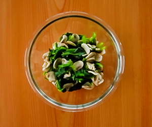 2小鍋に湯(分量外)を沸かし、ほうれん草とマッシュルームをゆでる。ザルにあげて湯を切る。