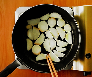 2フライパンに油、さといもを入れて火にかける。さといもに火が通るまで弱火〜中火で加熱する。
