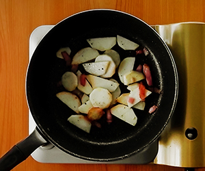 3ベーコンを加え、全体を炒め合わせてAで調味する。