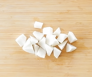1玉ねぎはみじん切りにする。これを耐熱容器に入れ、ラップをふんわりして、電子レンジで2分加熱し、粗熱をとる。長芋は皮をむいて乱切りにする。