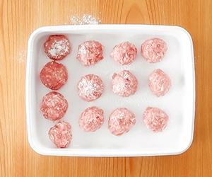 2ボールに豚ひき肉、1の玉ねぎ、卵、Aを全て入れ、手で練るようにして混ぜる。これを25~30gずつのボール状に丸め、片栗粉(分量外)を多めにまぶす。