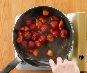 4Bを全てフライパンに入れ、弱火でとろみがつくまで混ぜながら加熱する。ここにミートボールと長芋を入れてさっくり混ぜる。