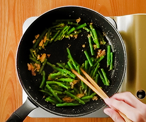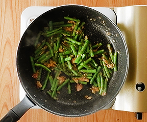 3ツナに火が通ったらカレー粉を加え、香りが立つまで軽く炒め、さやいんげんを加えて混ぜ合わせる。