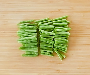 1さやいんげんは両端を切り落とし、3〜4cmの長さに切る。熱湯で1分半ほどサッとゆでて、ザルにあげて水けをふく。