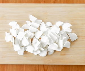 1かぶは皮をむき、薄切りにする。葉は、細かく刻み、さっと熱湯で湯がく。