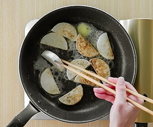 3フライパンにごま油を熱し、大根を入れて両面を焼く。焼き色がついたらバターを加えて香りを出す。