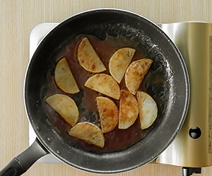 43に2を加え、焦げないように弱火で1〜2分煮詰めながら絡め、ツヤが出たら火を止める。
