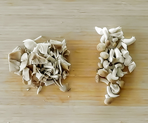 2しめじ、まいたけ、えのきは石づきを切り落としてほぐし、2cm幅に切る。玉ねぎとにんじんはみじん切りにする。