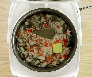 43の上にローリエとバターをのせ、炊く。(炊飯器に早炊きモードがあれば早炊きがおすすめです。)
