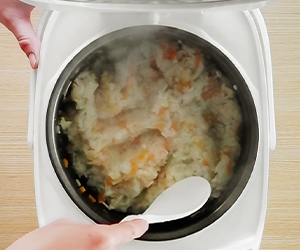 3炊飯釜に米を入れ、Aと2を加えて軽く混ぜ合わせる。