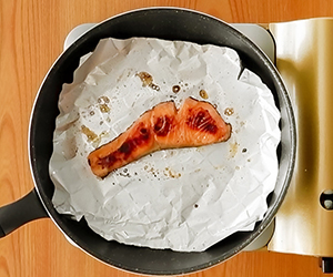 3ペーパータオルでサーモンの表面をふく。フライパンにホイルシートをしき、焦げないように様子を見ながらふたをして弱火で3分ほど焼く。