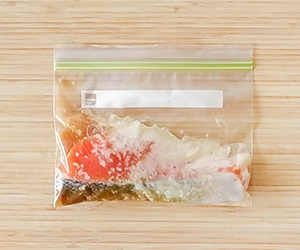 1ペーパータオルで水けをふいたサーモンとAを保存袋に入れ、やさしく和える。