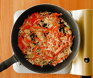 2フライパンにサラダ油の半分を中火で熱し、えのき、にんじん、玉ねぎを炒め、一度とり出す。