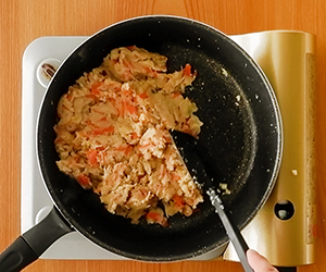 3同じフライパンに残りのサラダ油を入れ、おからを水けを飛ばすように弱火で炒める。野菜を戻し入れ、あさりも汁ごと加え、おからに吸わせるように炒め合わせる、