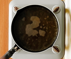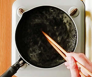 3弱火のまま、水溶き片栗粉をまわし入れ、ゆっくり混ぜながら とろみがつくまで加熱する。