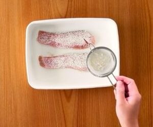 1鮭にAで下味をつける。焼く直前に小麦粉をまぶす。