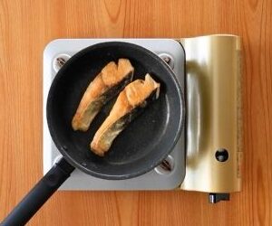 2フライパンに油を熱し、鮭の表になる面から中火で両面焼く。焼けたらとり出す。