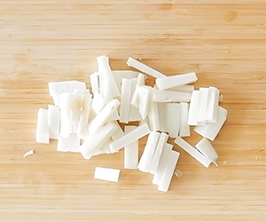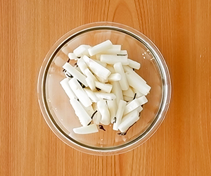 1長芋は皮をむき、4cmくらいの短冊切りにする。分量外の水とお酢に2~3分つけ、ザルにとる。