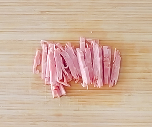 2ベーコンは細切りにする。玉ねぎはみじん切りにする。