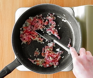 3フライパンにオリーブオイルとにんにく、ベーコンを入れて弱火で香りを出す。脂が出たら玉ねぎを入れて中火でしんなりするまで炒める。