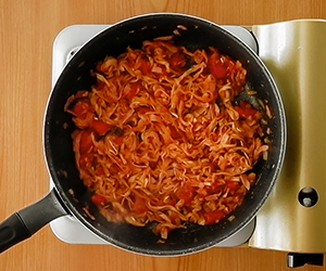 4ここに切り干し大根を加え、油をなじませるように1〜2分炒め、トマト水煮缶とAをすべて加え、5~10分ほど煮こむ。最後に味をみて、塩こしょう(こしょうのみでも可)で味をととのえる。