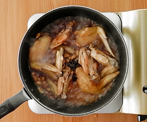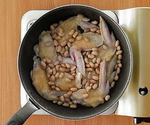 3煮込み用の鍋(又はフライパン)にごま油を熱し、手羽先を皮目から焼き、全体に焼き色をつける。大豆も加えて全体を和える。