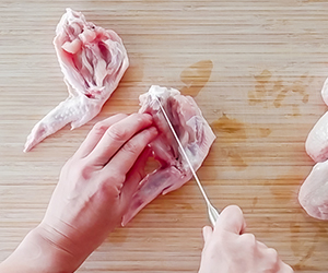 2手羽先は骨に沿って切りこみを1本入れる。大豆はザルにあげ、水気をしぼっておく。