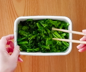 5菜の花はザルにあげ、しっかりしぼってから4に加え、桜えびも加えたら、さっくりと和える。