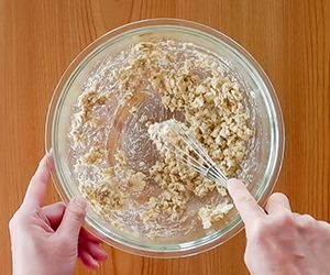 4ボウルに水ぎりした豆腐を入れ、泡立て器でなめらかになるまでつぶす。Bの白すり胡麻、塩麹、砂糖、醤油を加えてよく混ぜ、白和え衣をつくる。