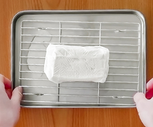 1木綿豆腐はペーパータオルで包み、耐熱容器に入れて、600Wの電子レンジで2分加熱する。その後軽く重しをして10分ほど水切りする。