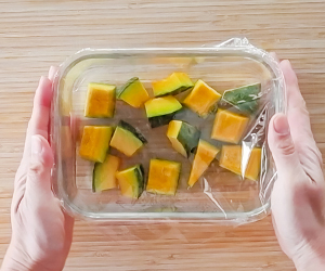 1かぼちゃは種とワタをとり、皮付きのまま2〜3cm角に切る。耐熱容器に入れてふんわりラップをかけ、電子レンジ600Wで4〜5分加熱し、竹串がスッと通るやわらかさにする。加熱後に水けが出たら軽くふきとる。