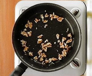 2くるみは粗く刻む。フライパンで弱火で30秒ほど乾煎りする。